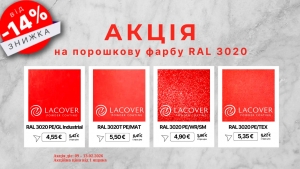 Закохайся у вигідну ціну на фарбу LACOVERАкція до Дня Святого ВалентинаЛише 9–13 лютого: знижки від 14% на фарбу RAL 3020: RAL 3020 PE/GL Industrial — 4,55 € (замість 5,42 €) RAL 3020T PE/MAT — 5,50...