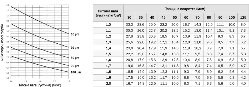 Залежність витрати фарби в (м2/кг) від товщини покриття (мкм) та питомої ваги (густини) фарби (г/см3)