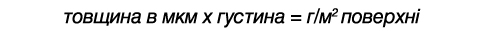 Розрахунковий метод визначення теоретичної витрати фарби на одиницю площі в (г/м²) з урахуванням товщини покриття (мкм) та питомої ваги (густини) фарби (г/см³)