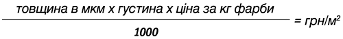 Метод розрахунку для визначення теоретичної витрати фарби на одиницю площі в (грн/м²) з урахуванням товщини покриття (мкм), питомої ваги (густини) (г/см³) та ціни за кілограм фарби (грн/кг).